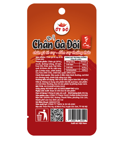 Mô tả sản phẩm: Chân gà với lớp da mềm, gân giòn, khi nhai sẽ có cảm giác dai giòn sần sật cực đã, được tẩm ướp kì công từ các gia vị và thảo mộc đặc trưng như xuyên tiêu, ớt, hoa hồi, quế,…đem lại hương vị đậm đà, cay tê.