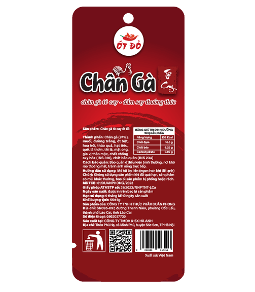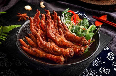 Mô tả sản phẩm: Chân gà với lớp da mềm, gân giòn, khi nhai sẽ có cảm giác dai giòn sần sật cực đã, được tẩm ướp kì công từ các gia vị và thảo mộc đặc trưng như xuyên tiêu, ớt, hoa hồi, quế,…đem lại hương vị đậm đà, cay tê.