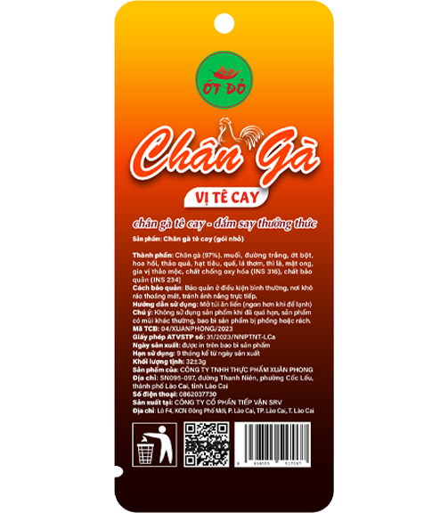 Mô tả sản phẩm: Chân gà với lớp da mềm, gân giòn, khi nhai sẽ có cảm giác dai giòn sần sật cực đã, được tẩm ướp kì công từ các gia vị và thảo mộc đặc trưng như xuyên tiêu, ớt, hoa hồi, quế,…đem lại hương vị đậm đà, cay tê.
